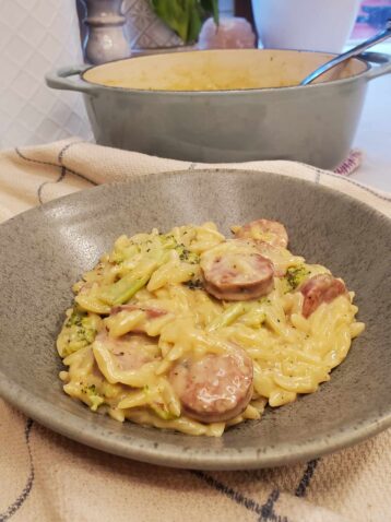 Store bought chicken sausage is tossed with cheesy orzo pasta and broccoli. It is a one pan meal which makes it convenient and DELICOUS! I like to use Aidells roasted garlic & gruyere cheese chicken …