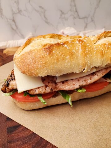 Healthy grilled chicken breast with citrus seasoning, a delicious Caesar spread that has Dijon, red pepper flakes, and fresh lemon zest. This sandwich is layered with tomato slices, romaine lettuce, and swiss cheese on a …