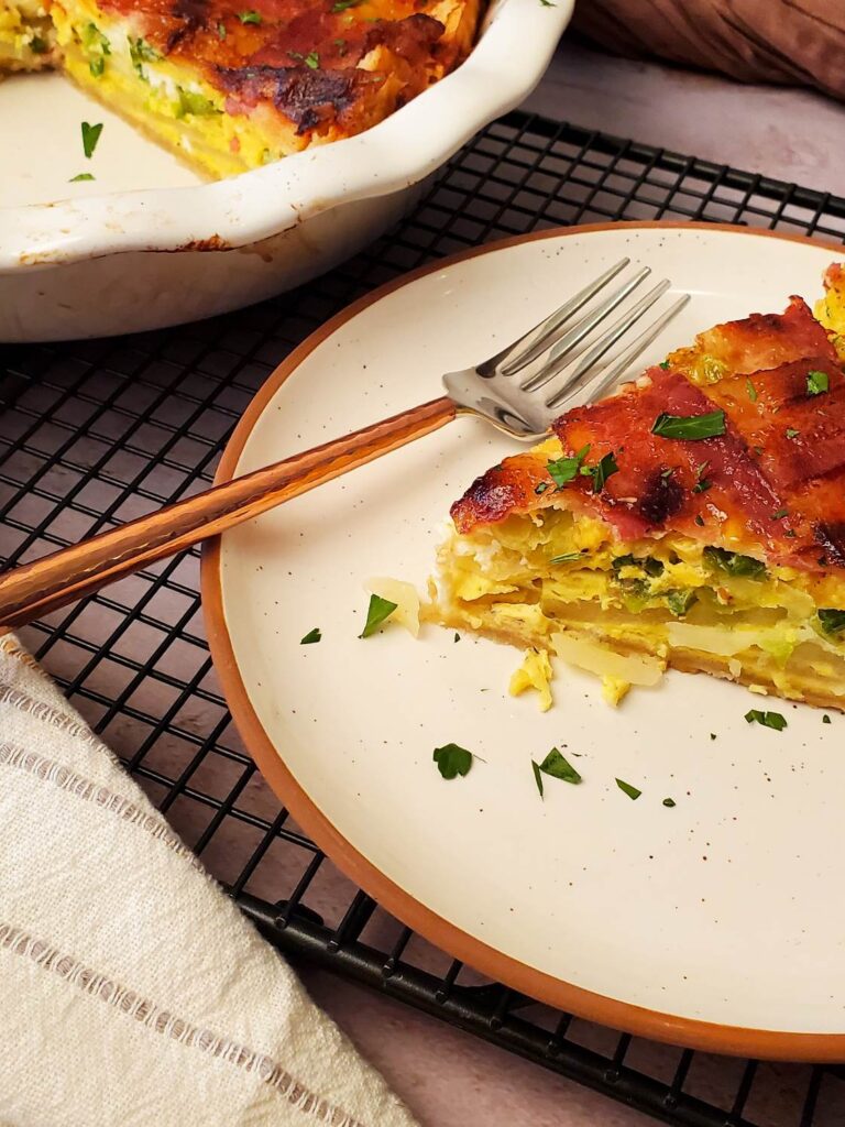 A scrumptious pie crust filled with potatoes, bell pepper, jalapeno, eggs, cheese, and finished off with maple syrup brushed bacon! This pie has all the best breakfast flavors in one slice and makes it so …