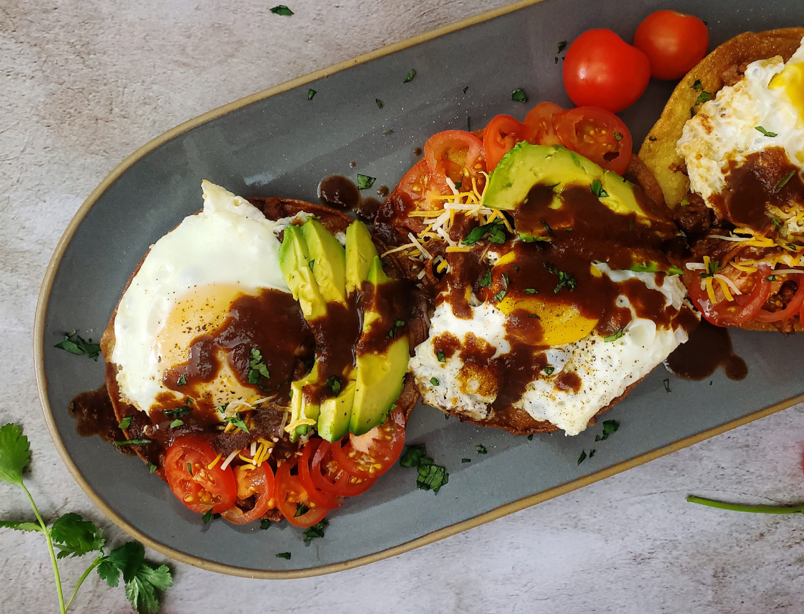 Magnificent crispy tortilla shells topped with chorizo sausage, cheese, fresh grape tomatoes, and fresh avocado. Topped with a fried egg, and finished with mole de Puebla sauce, makes for the PERFECT BRUNCH! I recently teamed …