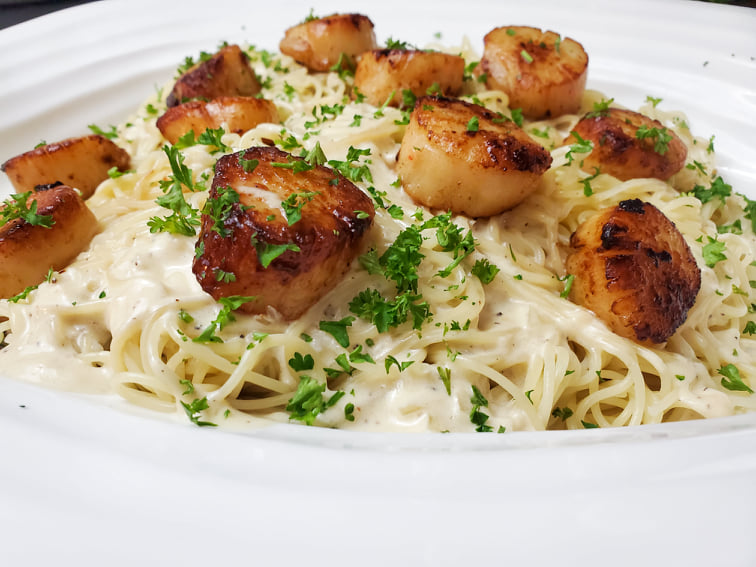 A magnificent cream sauce with garlic, onions, and vanilla that indulges the taste buds. It is tossed with angel hair pasta with the star of the show front and center… Gorgeous pan seared sea scallops! …
